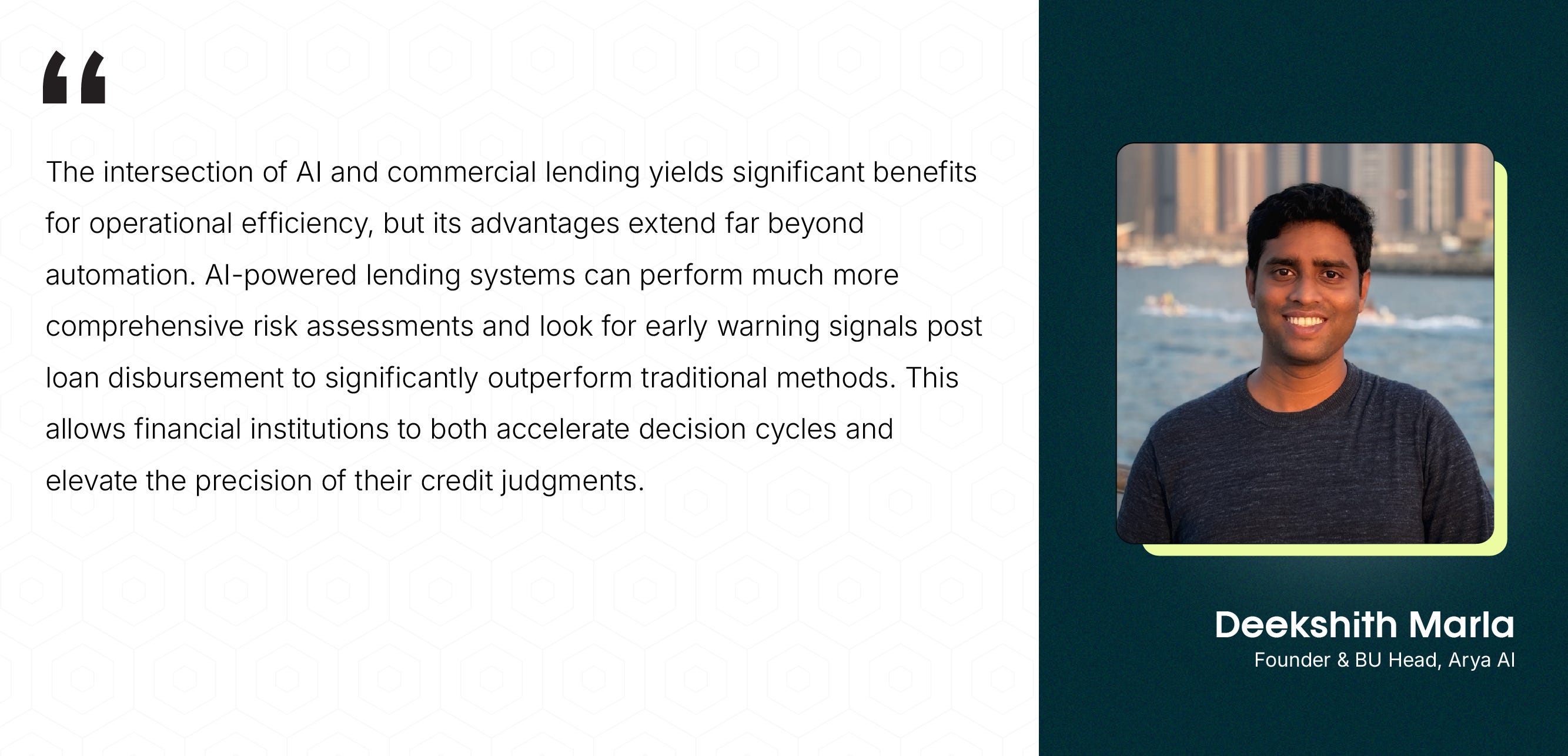 Commercial lending is a space that’s quite complex, and its workflow is equally convoluted: application intake, document ingestion, KYC/AML & fraud screening, risk assessment, credit underwriting, loan structuring, approval documentation, loan disbursement, monitoring of early warning signals, and closure.